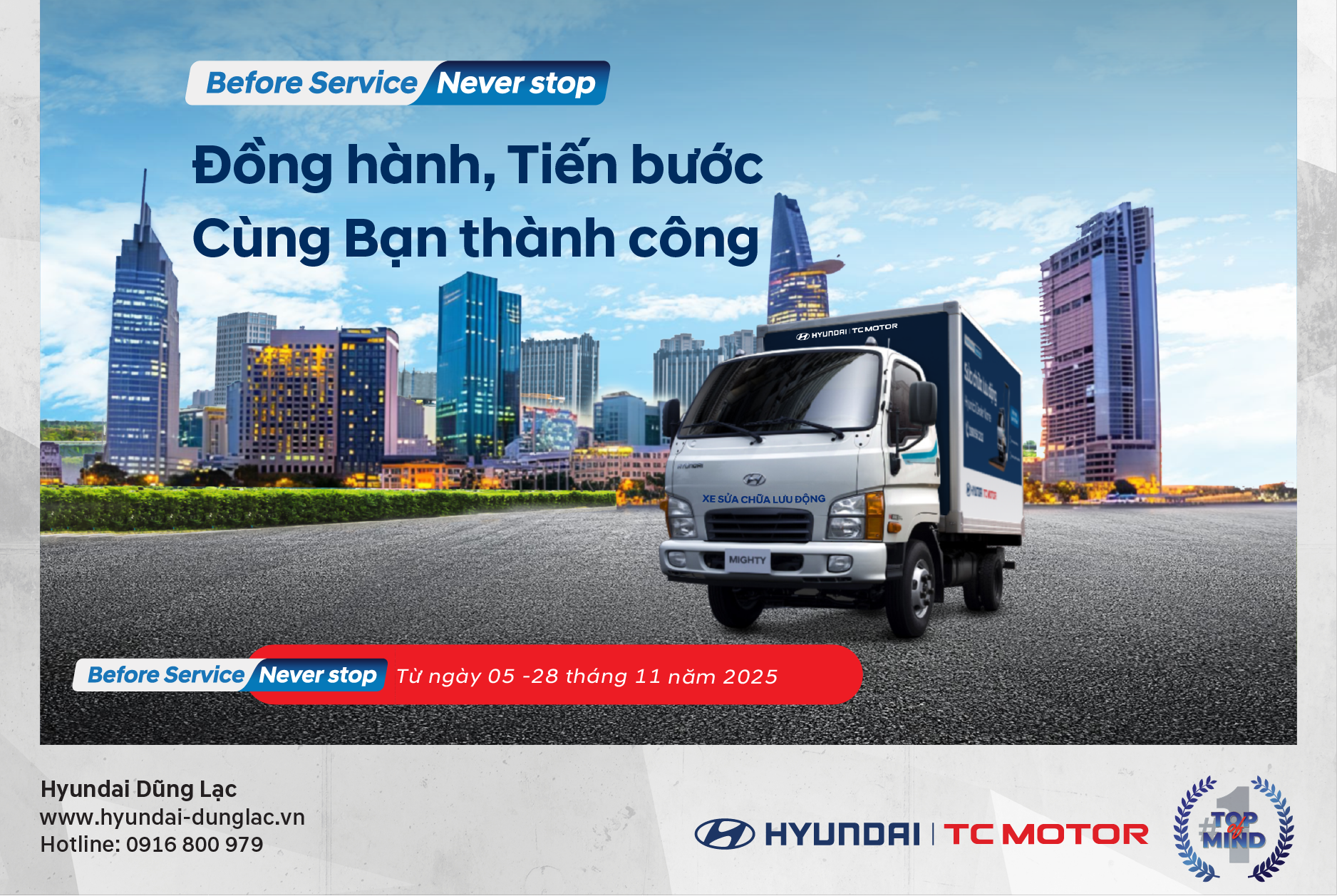 Nhằm tri ân và mang đến sự an tâm tuyệt đối trong quá trình sử dụng xe, Hyundai Dũng Lạc chính thức triển khai chương trình “BEFORE SERVICE NEVER STOP – Đồng hành, tiến bước cùng bạn thành công” diễn ra tại Nghệ An và Hà Tĩnh từ ngày 05/11 đến 30/11/2025.