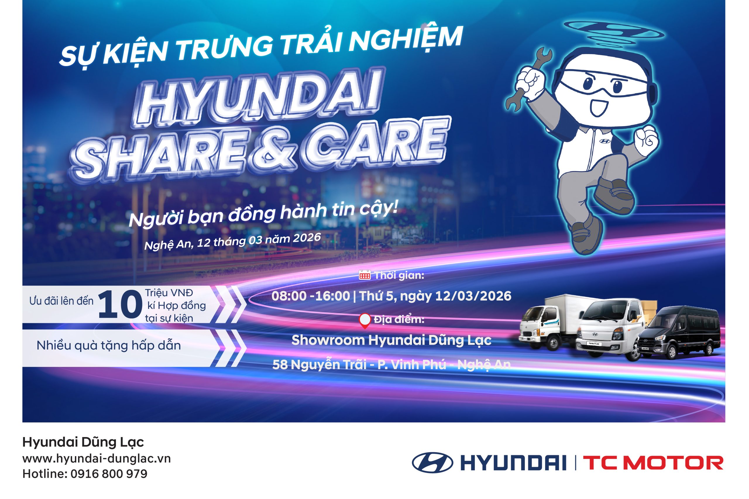 Trân trọng kính mời quý khách hàng tham gia chương trình “𝐓𝐫𝐮̛𝐧𝐠 𝐛𝐚̀𝐲 𝐯𝐚̀ 𝐥𝐚́𝐢 𝐭𝐡𝐮̛̉ 𝐝𝐨̀𝐧𝐠 𝐱𝐞 𝐭𝐚̉𝐢 𝐇𝐲𝐮𝐧𝐝𝐚𝐢” từ 08h00 – 16h00 ngày 12/03/2026 tại 𝐒𝐇𝐎𝐖𝐑𝐎𝐎𝐌 𝐇𝐘𝐔𝐍𝐃𝐀𝐈 𝐃𝐔̃𝐍𝐆 𝐋𝐀̣𝐂 – 58 NGUYỄN TRÃI, P. VINH PHÚ, NGHỆ AN và tận hưởng vô vàn quà tặng cùng khuyến mãi “𝐒𝐢𝐞̂𝐮 𝐇𝐨𝐭” chỉ có duy nhất trong ngày diễn ra sự kiện: